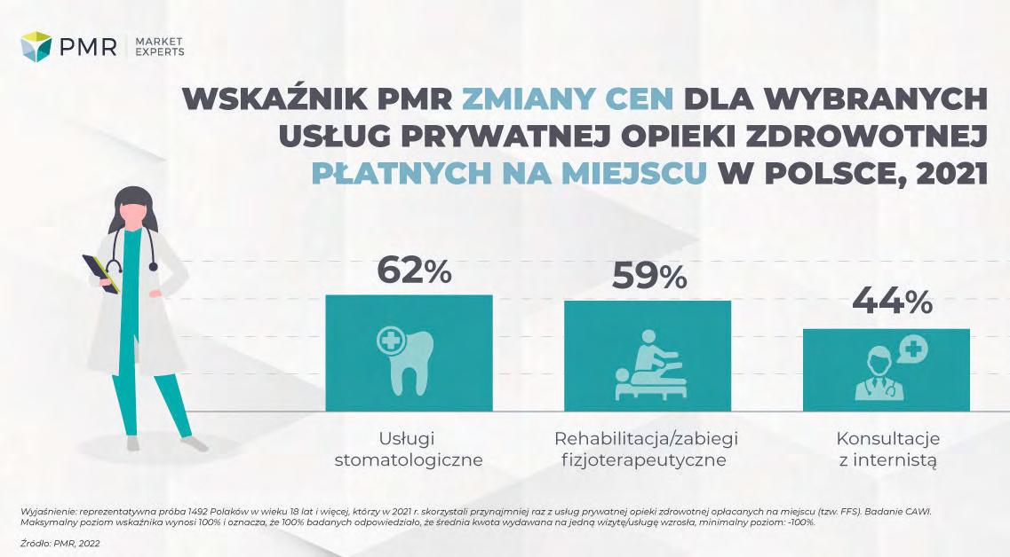 Według raportu firmy PMR ,,Rynek prywatnej opieki zdrowotnej w Polsce 2022. Analiza rynku i prognozy roz woju na lata 2022-2027” wzrost cen jest jednym z głów nych wyzwań dla rynku prywatnych usług zdrowotnych w Polsce. Według PMR w całym 2022 r. ceny usług am bulatoryjnych i innych związanych ze zdrowiem wzrosną o około 14% w porównaniu do 2021 r. - Ceny usług medycz nych będą się zwiększały, co z jednej strony wpłynie na wzrost nominalnej wartości rynku usług prywatnej opieki zdrowotnej, ale z drugiej zmniejszy dynamikę realną m.in. z powodu ograniczonej siły nabywczej Polaków – mówi Ju styna Zagórska, starszy analityk rynku farmaceutycznego i ochrony zdrowia w PMR i autorka raportu. Wpłynie to na decyzje zakupowe Polaków, którzy mogą ograniczać nie które prywatne wizyty opłacane na miejscu, np. wizyty u dentystów, ale z drugiej strony może spowodować więk sze zainteresowanie abonamentami medycznymi i pry watnymi ubezpieczeniami zdrowotnymi – dodaje.