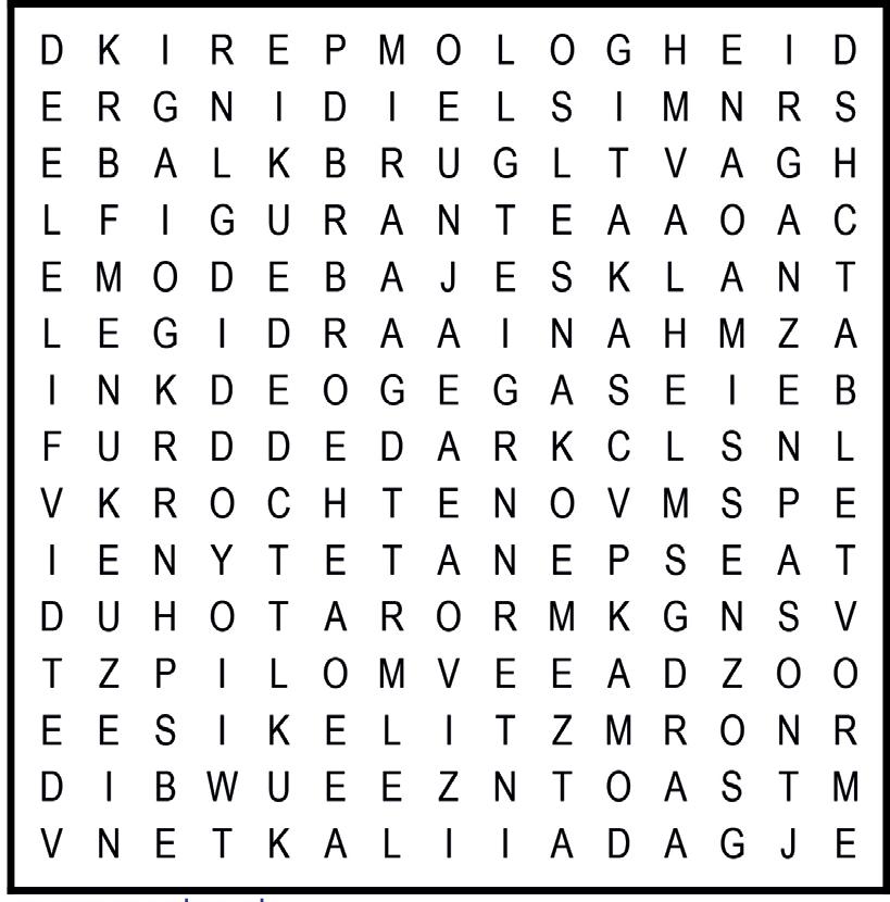 De woorden zitten horizontaal, verticaal en diagonaal in alle richtingen in de puzzel verstopt. Ze kunnen elkaar overlappen. Zoek ze op en streep ze af. De overblijvende letters vormen achter elkaar gelezen de oplossing.