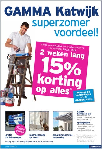 * De 15% korting op alles is geldig in combinatie met alle aanbiedingen uit de GAMMA krant maar niet op reeds bestelde artikelen, Cadeaupas, Bulky, Kluscontainer, desktops, tablets, verhuur en niet op artikelen uit het ‘Extra Goedkoop’ assortiment. De actie is alléén geldig bij GAMMA Katwijk aan Zee t/m zaterdag 29 juni 2013. © GAMMA
