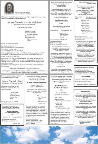 Jeane Cornelia van der Meij-Sloof echtgenote van Piet van der Meij in de leeftijd van 69 jaar. Rick en Christian Daisy en GertJan Damijan, Raeven Peter en Louise Ronald en Lissy Robin en Jenny Dennis Katwijk, 22 september 2017 Correspondentieadres: Mies Schoneveld Uitvaartbegeleiding t.a.v. Dhr. P. van der Meij J. v.d. Vegstraat 63, 2225 TR Katwijk Woensdag 27 september is er van 19.00 tot 20.00 uur gelegenheid tot condoleren in de Oranjezaal van Het Anker, Voorstraat 74, ingang Jeugdhuis te Katwijk aan Zee. Wij nodigen u uit voor de afscheidsdienst van Jeane op donderdag 28 september om 13.30 uur in de aula van begraafplaats Duinrust aan de Parklaan te Katwijk. Na de afscheidsbijeenkomst zal de begrafenis daar plaatsvinden. Aansluitend is er gelegenheid elkaar te ontmoeten in de koffiekamer van de aula. Jeane hield van bloemen, in dit geval geen witte. Mocht u geen persoonlijke uitnodiging hebben ontvangen, dan hopen wij u toch met deze aankondiging te bereiken. Tot onze droefheid is overleden, onze geliefde schoonzuster