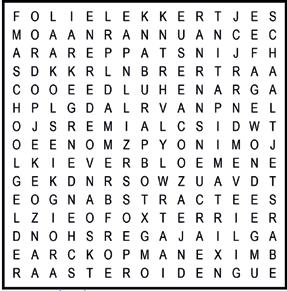 De woorden zitten horizontaal, verticaal en diagonaal in alle richtingen in de puzzel verstopt. Ze kunnen elkaar overlappen. Zoek ze op en streep ze af. De overblijvende letters vormen achter elkaar gelezen de oplossing