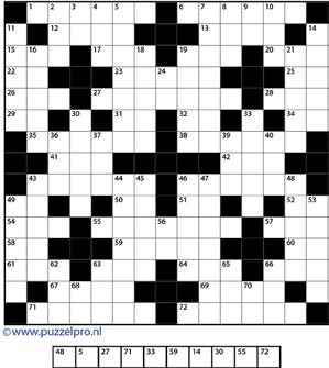 13 honingbij 15 grote bijl 17 explosieve stof (afk.) 19 naaldboom 20 harde duw 22 muzieknoot 23 verbouwen 25 mijns inziens 26 olm 27 misdrijf 28 water in Utrecht 29 Sovjet-Unie 31 Japans bordspel 32 tot afscheid 34 geografische mijl 35 mirakel 38 onoverwinnelijke vloot 41 vrouwtjesschaap 42 vliegende schotel 43 later 46 niet hetzelfde 49 pers. vnw. 50 na Christus 51 vader 52 Technische Hogeschool 54 behoeftig 55 Chinees gerecht 57 halsbont 58 dit is 59 computertoets 60 schuif 61 één en ander 63 welke persoon 64 afzonderlijk 66 twijg 67 geurige drank 69 smekend verzoek 71 tijdelijk bestuurder 72 speloefening. Verticaal: 2 Engelse bevestiging 3 Noord-Holland 4 kloosteroverste 5 opbouw 7 bediende 8 heidemeertje 9 emeritus 10 vervalst 11 legerplaats 14 Duitse sprookjesschrijver 16 deel v.e. vis 18 mannenstem 19 vierde Griekse letter 21 Griekse letter 24 lectori salutem 30 bijzonder groot 33 meubelstuk 36 wilde haver 37 lichtbeeld 39 inhoudsmaat 40 schraal 43 aaneenschakeling 44 slordig werken 45 dramatische ruzie 46 boomvrucht 47 hoofdstad van Kenia 48 brede sjaal 49 door water lopen 53 loodrecht 56 meterton 62 onheilsgodin 63 barenspijn 65 droog (van wijn) 66 afslagplaats bij golf 68 hectogram 70 debet.