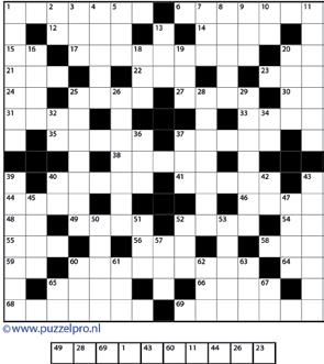 Breng letters uit de puzzel over naar de hokjes met hetzelfde nummer. Horizontaal: 1 bijna altijd 6 zeevis 12 grote dichte zak 14 onbesmet 15 niet parkeren 17 dominee 20 tot en met 21 afslagplaats bij golf 22 oppervlaktemaat 23 inzinking 24 slee 25 graansoort 27 staat in Amerika 30 legsel v.e. vogel 31 gehoorzaal 33 hoofdstad van Noorwegen 35 stemming 37 stijl 38 soort schaatsen 40 geldopbrengst 41 afgod 44 verbond 46 mestvocht 48 geluid v.e. ezel 49 heilige 52 wedren 54 zangnoot 55 stuk hout 56 wees gegroet 58 bakgerei 59 nummer 60 schuw 64 met dank 65 bladgroente 66 bezieling 68 Europese vrouw 69 narede. Verticaal: 1 psychisch 2 getijde 3 vruchtendrank 4 gewichtsaftrek 5 Engels bier 7 grote papegaai 8 land in Afrika 9 korte reis 10 voegwoord 11 feestverlichting 13 nageslacht 16 land in Zuid-Amerika 18 sjaal 19 biljartstok 20 pl. in Gelderland 25 malloot 26 vaccineren 28 Russische mosvlakte 29 uurwerk 32 lectori salutem 34 selenium 36 gard 37 scheepstouw 39 afval 40 Romanum Imperium 42 Chinese munt 43 nauwgezet 45 heel vervelend 47 pl. in Noord-Holland 50 innig samen 51 twijg 52 snelle loop 53 land in Zuid-Amerika 57 vlies 60 tijdperk 61 muurholte 62 vervalst 63 bitterheid 65 vader 67 noordoost.