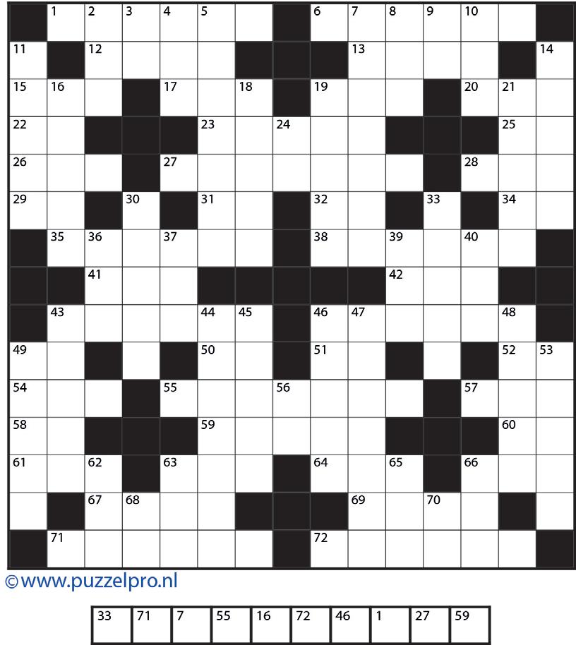 Breng letters uit de puzzel over naar de hokjes met hetzelfde nummer. Horizontaal: 1 dorp of stad 6 eenvoudig 12 geheimschrift 13 slachtoffer 15 energiezuinige verlichting 17 op de wijze van 19 oude lap 20 Chinese deegwaren 22 oosterlengte 23 Afrikaans dorp 25 nieuwe maan 26 oostzuidoost 27 te nuttigen 28 niet tegen 29 vader 31 nikkel 32 schuif 34 modern 35 spanning 38 deel v.e. dier 41 grote bijl 42 tennisterm 43 sleepboot 46 uitgeschreven filmtekst 49 voormiddag 50 tegenover 51 compagnon 52 Oude Verbond 54 pret 55 ambtsgewaad 57 Engels telwoord 58 lidwoord 59 een beetje scheel 60 Economische Zaken 61 Amerika (afk.) 63 huisdier 64 loofboom 66 een zeker iemand 67 dagboek op internet 69 koffiehuis 71 weegtoestel 72 imitatie. Verticaal: 2 soort beeldscherm (afk.) 3 als onder 4 gravin van Holland 5 steeds 7 afgodisch 8 inhoudsmaat 9 per persoon 10 water in Utrecht 11 afbraak 14 duivel 16 deel v. Frankrijk 18 dierentuin in Amsterdam 19 pl. in Limburg 21 toegangsweg 24 als boven 30 uitbouw aan een huis 33 bacterie 36 grote hoeveelheid 37 loofboom 39 deel v.e. korenhalm 40 opschudding 43 flauw voorwendsel 44 vitrine 45 machinemens 46 dramatische ruzie 47 Frans eiland 48 laten zien 49 op deze manier 53 draadje 56 schapengeluid 62 Algemeen Beschaafd Nederlands 63 varkenshok 65 deel v.e. viool 66 één en ander 68 lectori salutem 70 muzieknoot.
