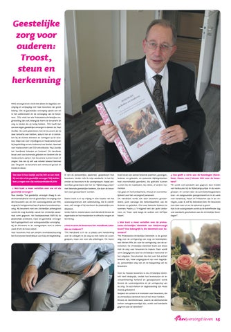 Er zijn de persoonlijke, pastorale gesprekken met bewoners. Verder richt ik mijn aandacht in het bijzonder op bewoners in de woongroepen. Naast persoonlijke gesprekjes zijn hier de ‘Bijbelzanguurtjes’ met bekende geestelijke liederen, die door de bewoners zeer gewaardeerd worden. Iedere week is er op vrijdag in elke locatie van het woonzorgcentrum een weeksluiting, die ik coördineer, zelf voorga of bij toerbeurt de plaatselijke predikanten. Verder heb ik enkele taken rond identiteit binnen de organisatie en het meedenken in ethische vragen en bezinning. 2 Hoe ervaren de bewoners het ‘Handboek Gebeden en Liederen’? “Dit Handboek is in de 1e plaats een handreiking voor de collega’s in de zorg op met name de woongroepen, maar ook voor alle afdelingen. Dit Hand-