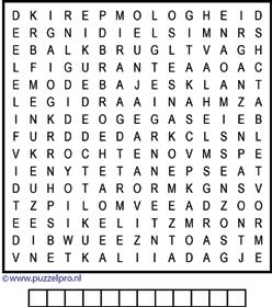 De woorden zitten horizontaal, verticaal en diagonaal in alle richtingen in de puzzel verstopt. Ze kunnen elkaar overlappen. Zoek ze op en streep ze af. De overblijvende letters vormen achter elkaar gelezen de oplossing.
