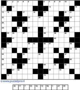 Breng letters uit de puzzel over naar de hokjes met hetzelfde nummer. Horizontaal: 1 dorp of stad 6 eenvoudig 12 geheimschrift 13 slachtoffer 15 energiezuinige verlichting 17 op de wijze van 19 oude lap 20 Chinese deegwaren 22 oosterlengte 23 Afrikaans dorp 25 nieuwe maan 26 oostzuidoost 27 te nuttigen 28 niet tegen 29 vader 31 nikkel 32 schuif 34 modern 35 spanning 38 deel v.e. dier 41 grote bijl 42 tennisterm 43 sleepboot 46 uitgeschreven filmtekst 49 voormiddag 50 tegenover 51 compagnon 52 Oude Verbond 54 pret 55 ambtsgewaad 57 Engels telwoord 58 lidwoord 59 een beetje scheel 60 Economische Zaken 61 Amerika (afk.) 63 huisdier 64 loofboom 66 een zeker iemand 67 dagboek op internet 69 koffiehuis 71 weegtoestel 72 imitatie. Verticaal: 2 soort beeldscherm (afk.) 3 als onder 4 gravin van Holland 5 steeds 7 afgodisch 8 inhoudsmaat 9 per persoon 10 water in Utrecht 11 afbraak 14 duivel 16 deel v. Frankrijk 18 dierentuin in Amsterdam 19 pl. in Limburg 21 toegangsweg 24 als boven 30 uitbouw aan een huis 33 bacterie 36 grote hoeveelheid 37 loofboom 39 deel v.e. korenhalm 40 opschudding 43 flauw voorwendsel 44 vitrine 45 machinemens 46 dramatische ruzie 47 Frans eiland 48 laten zien 49 op deze manier 53 draadje 56 schapengeluid 62 Algemeen Beschaafd Nederlands 63 varkenshok 65 deel v.e. viool 66 één en ander 68 lectori salutem 70 muzieknoot.