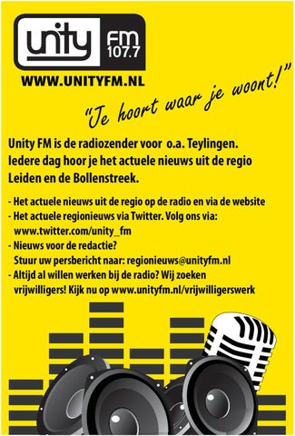 Unity FM is de radiozender voor o.a. Teylingen. Iedere dag hoor je het actuele nieuws uit de regio Leiden en de Bollenstreek. - Het actuele nieuws uit de regio op de radio en via de website - Het actuele regionieuws via Twitter. Volg ons via: www.twitter.com/unity_fm - Nieuws voor de redactie? Stuur uw persbericht naar: regionieuws@unityfm.nl - Altijd al willen werken bij de radio? Wij zoeken vrijwilligers! Kijk nu op www.unityfm.nl/vrijwilligerswerk