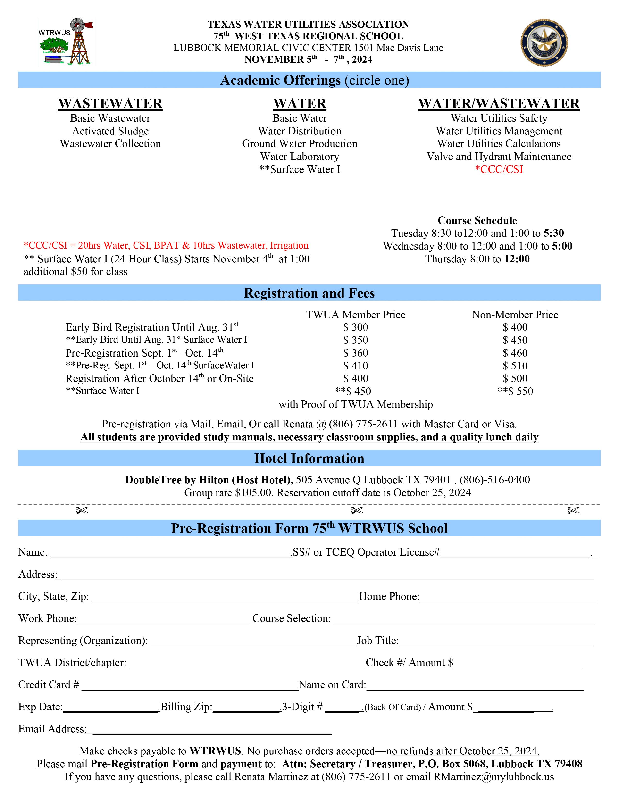 Annual School—The 106th Annual School will be held from September 23rd to 26th, 2024. All training classes (for annual school) will begin on Tuesday, September 24th, at 8:00 a.m. The last board meeting, awards, and reception will be held Monday beginning at 5:30 p.m. TWUA will make the ability to pre-register, but for those who last minute changes, onsite registration is always welcome. We recognize that you have a choice regarding
