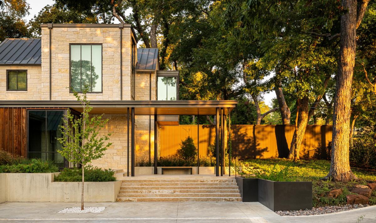The Casa de Ondas project was conceived for a 2-acre parcel of what was formerly a portion of the famed Crespi Estate in Dallas, Texas. The name, conceived from the home’s wave form roof, also applies to the significant biological reflection pool that hugs the front of the home and swimming pool on the back side of the primary living spaces. The stately contemporary home is uniquely sited to maintain a large heritage live oak, orienting the primary interior and exterior living spaces towards a western grove of more heritage trees along the property line.