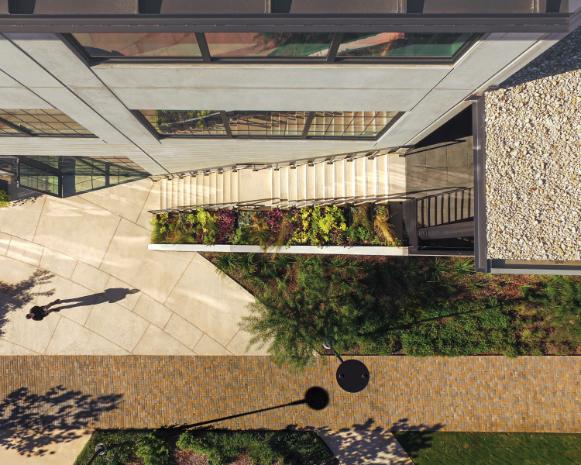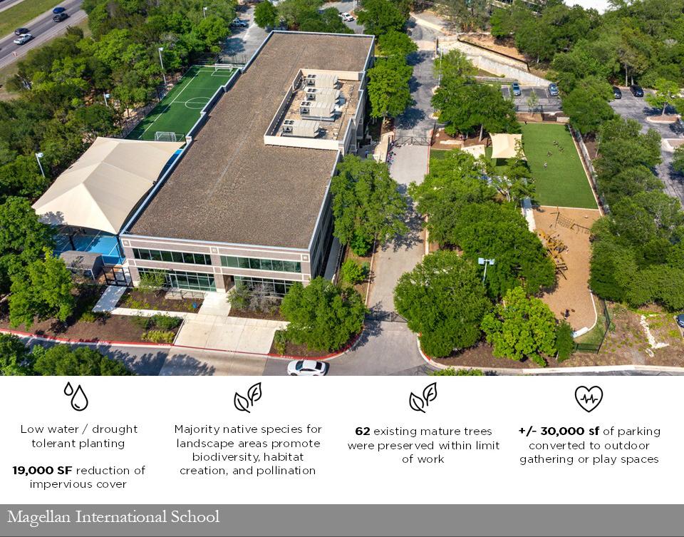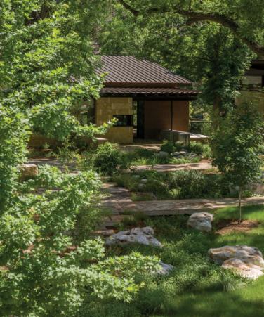Botanical Cafe transforms an underutilized Sunset Valley site into a hyperlocal botanical destination rooted in ecological stewardship, sensory experience, and community connection. More than 90 mature trees were preserved, with 75 additional trees planted and 19,000 square feet conserved as native habitat. Over 7,000 native and adapted plants support biodiversity, pollinators, and seasonal change. Integrated Low Impact Development strategies, including a detention basin, recirculating water-quality stream, irrigation field, and cistern, create a closedloop water system. Reclaimed limestone, custom site elements, Dark Sky lighting, and edible plantings seamlessly
