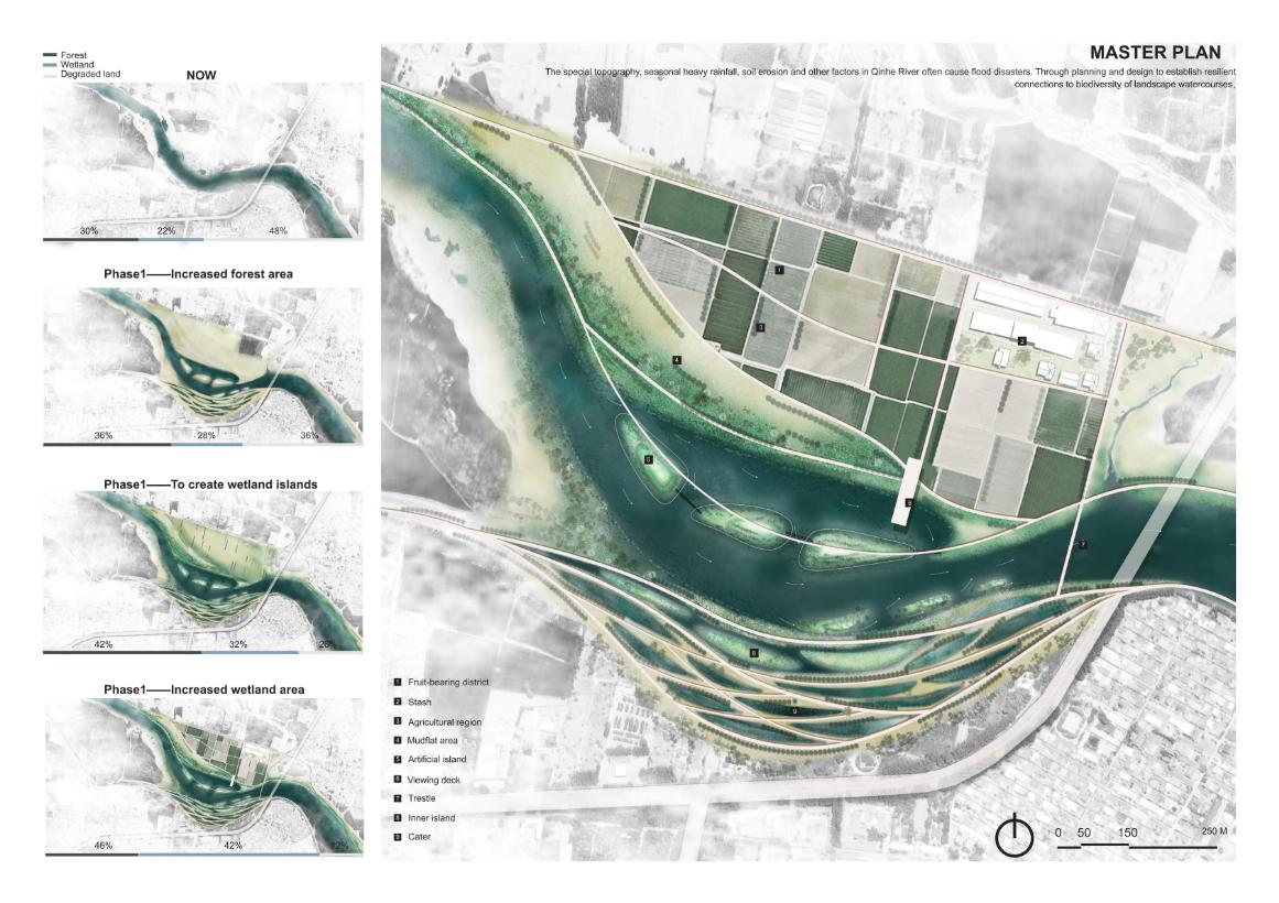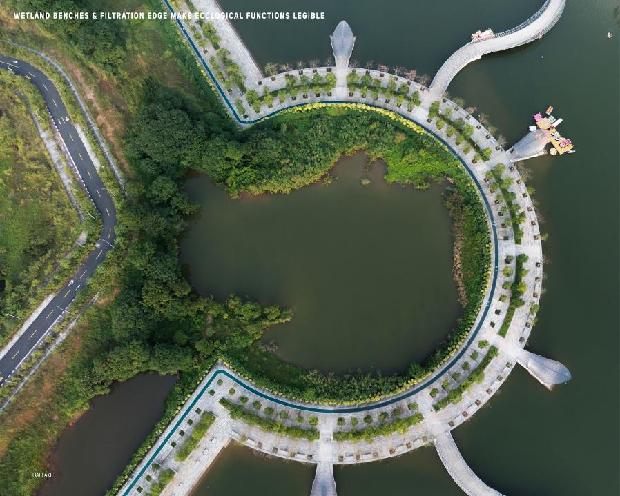 BoAi Lake reconfigures a fragmented landscape of disconnected fish ponds into a contiguous urban lake and civic waterfront. The project restructures former aquaculture infrastructure as climate-adaptive landscape infrastructure that integrates flood resilience, ecological restoration, and continuous public access. Through stabilized water levels, reconstructed shorelines, wetlands, and a layered network of promenades and public spaces, the lake functions simultaneously as a hydrologic system and a vibrant civic landscape. Today, BoAi Lake serves as a shared environmental, cultural, and recreational centerpiece for the surrounding community.