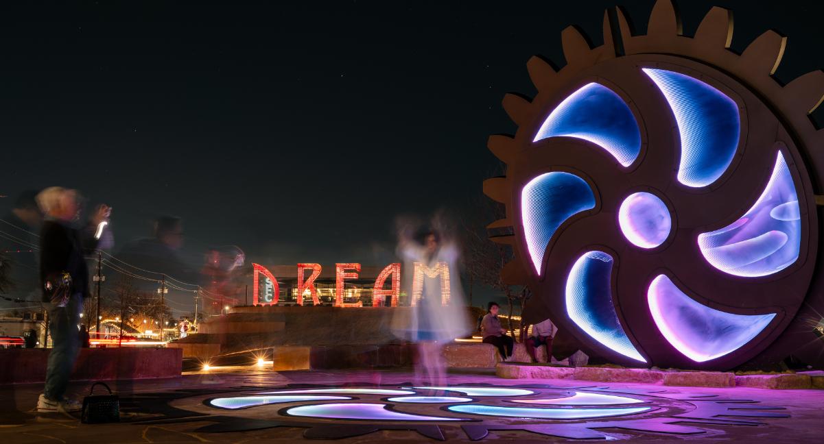 Rotary Dream Park transforms an underutilized downtown site into a vibrant civic destination that unites monumental public art, green space, and community identity. Anchored by the iconic DREAM and BOUNDLESS sculptures, the park blends art, recreation, and placemaking to create an inviting gathering space for all users. Sustainable design strategies— including native landscaping and pedestrian-focused amenities— enhance walkability and long-term performance. The park has catalyzed downtown activation, increased foot traffic, and strengthened Arlington’s cultural and economic vitality.