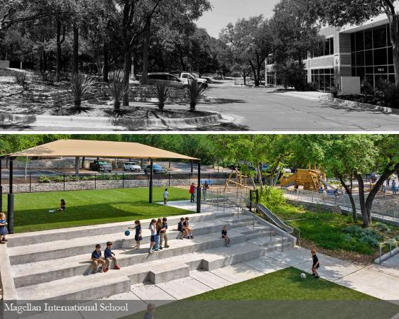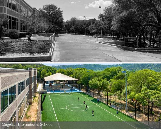 From an office complex to an International Baccalaureate School for K-12th students, the Magellan International School is re-purposing a site to serve the surrounding community in a unique way. The design team transformed an existing asphalt parking lot into an outdoor learning environment that allows for discovery, exploration, play and connection to form a new identity for the school. Playgrounds, various learning spaces, a multi-purpose field for athletics, hardcourts for PE and recess enrich the daily curriculum and student experience all guided by a design approach centered on overall student wellness..