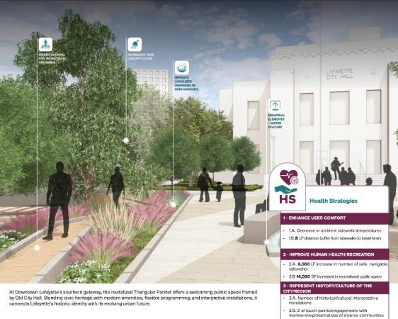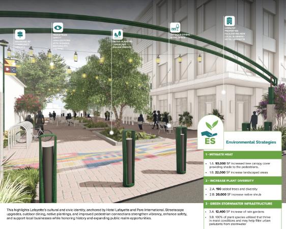 The Downtown Lafayette Corridor Revitalization Plan transforms Jefferson Street and Lee Avenue from overlooked backstreets into vibrant, pedestrian corridors that celebrate Lafayette’s cultural legacy while addressing historic flooding. Corridors are envisioned as welcoming gateways; weaving green infrastructure, public art, and cultural spaces into a framework that supports local businesses, events, and community life. Lafayette’s first inclusive, transparent engagement process was central to shaping a shared vision for revitalization and long-term stewardship. Rooted in history and firmly focused on the future, the plan balances preservation with innovation through sustainable strategies that enhance comfort, accessibility, and resilience.