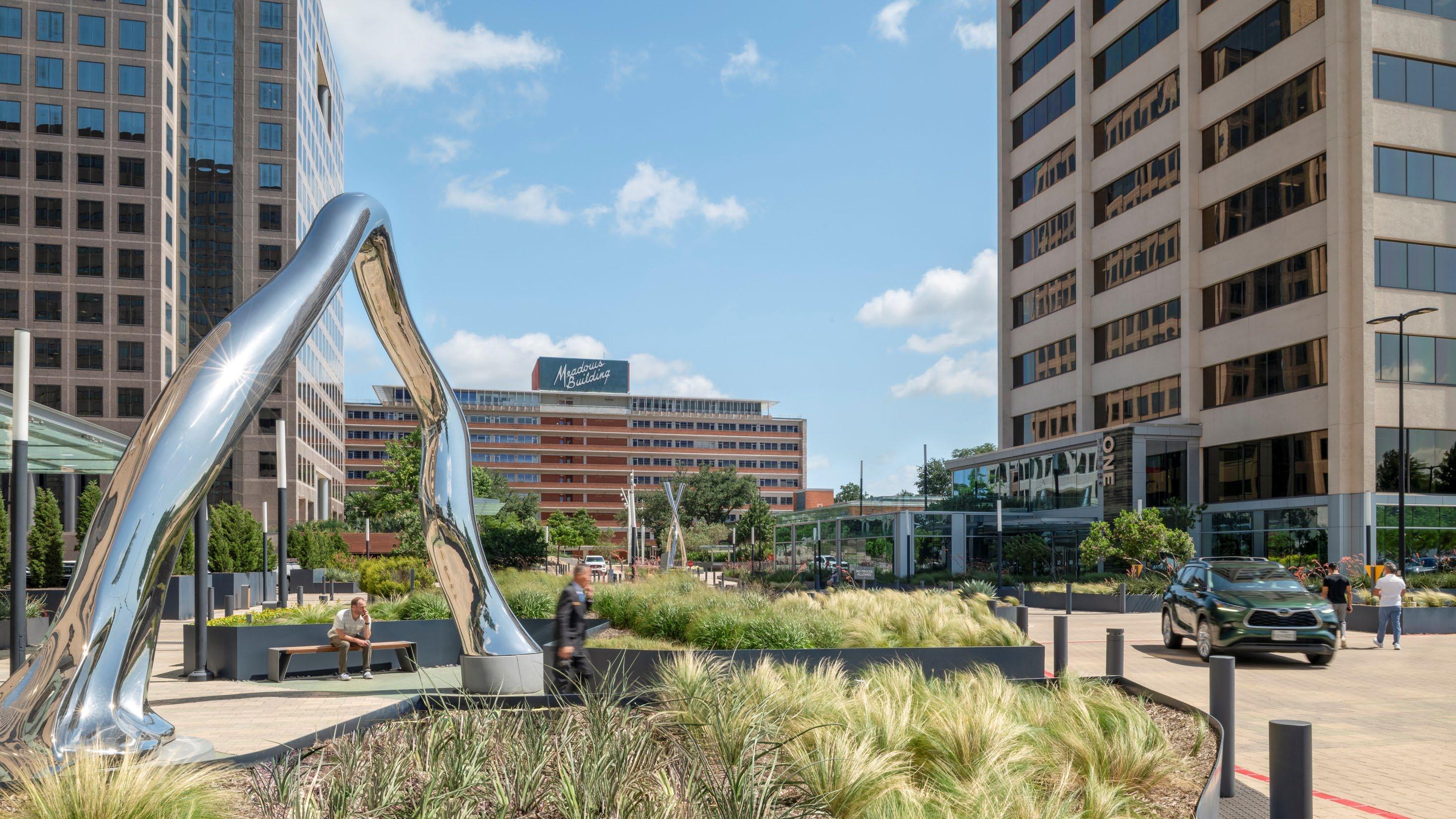 The Energy Square campus redesign transforms a fragmented, multi-era office complex into a cohesive pedestrian-oriented environment anchored by the historic Meadows Building. Through landscape architecture, the project unifies four disparate buildings, resolves complex structural constraints, and creates a clear campus identity. Inspired by midcentury modern principles, the design integrates native and naturalized planting, preserves mature trees, and balances vehicular access with walkability, establishing a resilient, peoplecentered landscape that supports contemporary workplace life in North Texas.
