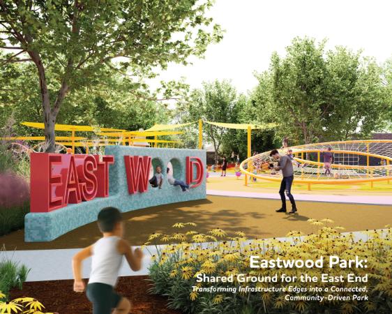 Eastwood Park transforms infrastructure-adjacent land into civic ground for Houston’s East End. The 9-acre neighborhood park, bordered by active freight rail and light rail corridors, serves a predominantly Latino, historically under-served community. Rather than screening infrastructure, the design embraces visibility and movement to connect community life with its urban context. Community listening shaped program priorities, including an expanded skate park, culturally expressive basketball court, accessible playground, and flexible athletic fields. The 540-foot Timeline Boulevard anchors the park with engraved text, mosaic paving, and a gathering plaza. Bioswales, on-site cut-and-fill, and native planting support resilient performance.
