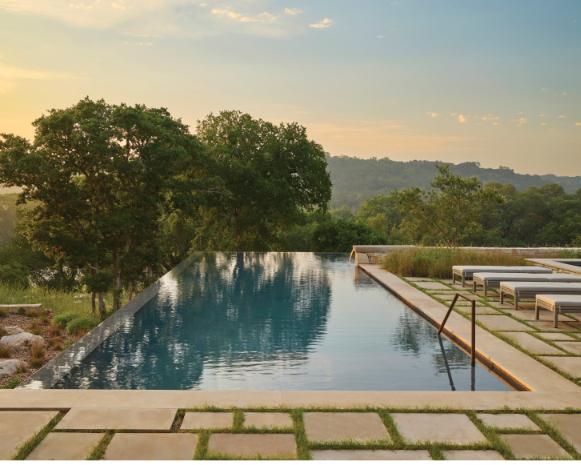 Point Breeze Ranch was conceived as a forever home for our client and their grown children’s families. The linear geometry of the primary house takes advantage of expansive views of the stunning Texas hill country. Structures were sited to preserve the mature tree canopy, with jewel-box courtyards providing intimate private spaces that stand in contrast to the open vistas to the east. Stone perimeter walls cut through the terrain and define the pool deck and outdoor rooms. Each gesture celebrates the land’s character and creates a timeless sanctuary rooted in ecology and family connection.