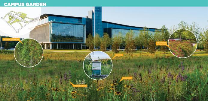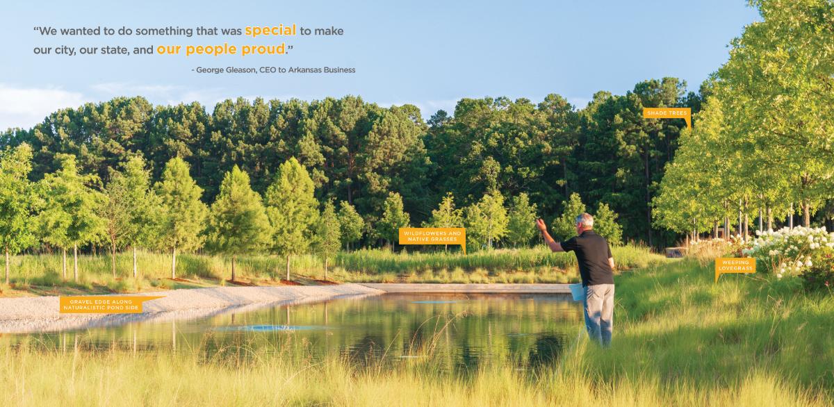 The 44-acre Bank OZK campus showcases community and contemplative art in a garden setting to support the CEO’s vision of establishing an attractive campus with park-like amenities to bring together local employees and those visiting for training. The main axis aligns with the building’s atrium and guides visitors and employees from the lush, formal south entry with several alleles to the more relaxed pedestrian promenade in the north. Art anchors the campus design including Pro Terra et Natura, the second tallest sculpture in Arkansas. Wildflowers and native grasses throughout the site support on-site beehives.