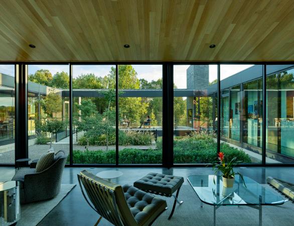 This residential landscape draws inspiration from the grassland ecology of Northwest Arkansas, a stark departure from the unsustainable lawns of the surrounding golf course community. Plantings of native grasses provide a dynamic setting that changes dramatically through the seasons, while also reducing water consumption and sinking carbon deep into the soil. Based on a Roman courtyard house, the building faces inward, privileging the central landscape that lies at the heart of the project. A series of terraced plantings lead from the courtyard down to a garden of switchgrass bounded by an existing woodland.