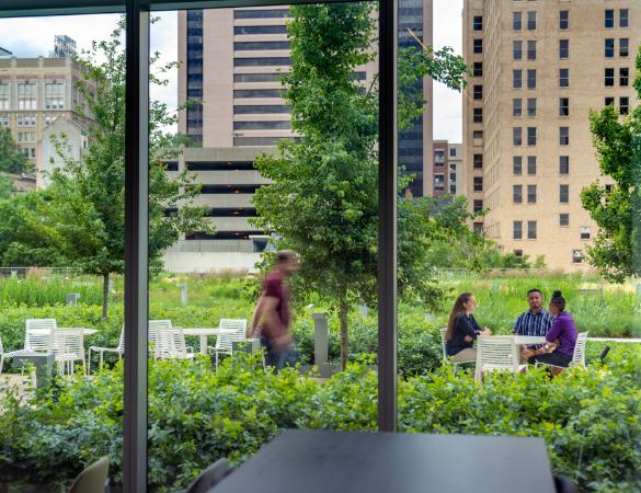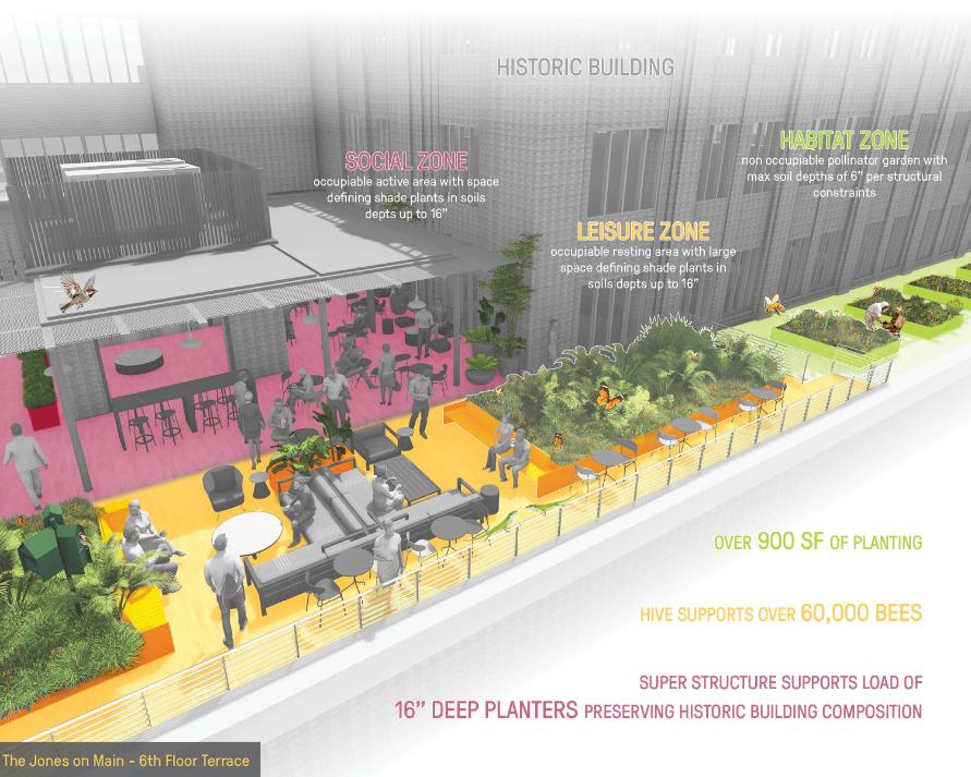 Jones on Main 6th floor terrace retrofit transforms an inaccessible 1929 mechanical roof atop Houston's historic JPMorgan Chase Building into a 3,750-square-foot rooftop terrace serving the entire building community. Through innovative structural engineering that distributes loads without compromising the Art Deco landmark's integrity, the design creates a floating superstructure above the original roof. Plantings adapted to extreme microclimate conditions, active beehives integrated with ground-floor food operations, and flexible gathering spaces establish urban habitat while fostering daily tenant connection.