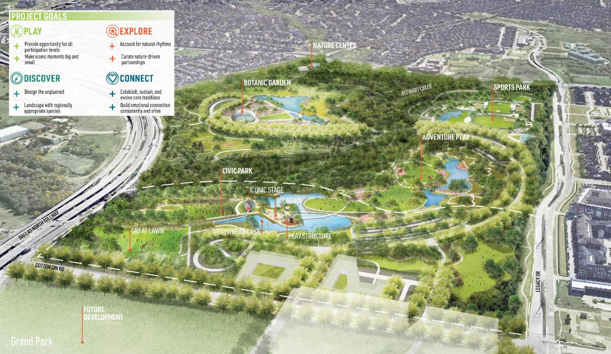 Grand Park reimagines 320 acres of ecologically diverse land, transforming Frisco’s most strategic remaining open space into a regional destination where recreation and natural systems are inseparably linked. Civic Park, the 40-acre first phase, serves as the park’s primary gateway, introducing a living, biofiltered recreational lake, an iconic performance stage, and multi-generational gathering spaces that invite exploration, discovery, play, and connection while establishing a resilient framework that marries civic life with ecological function.