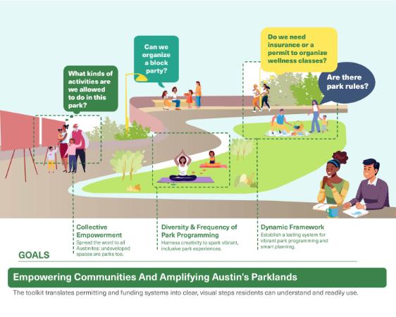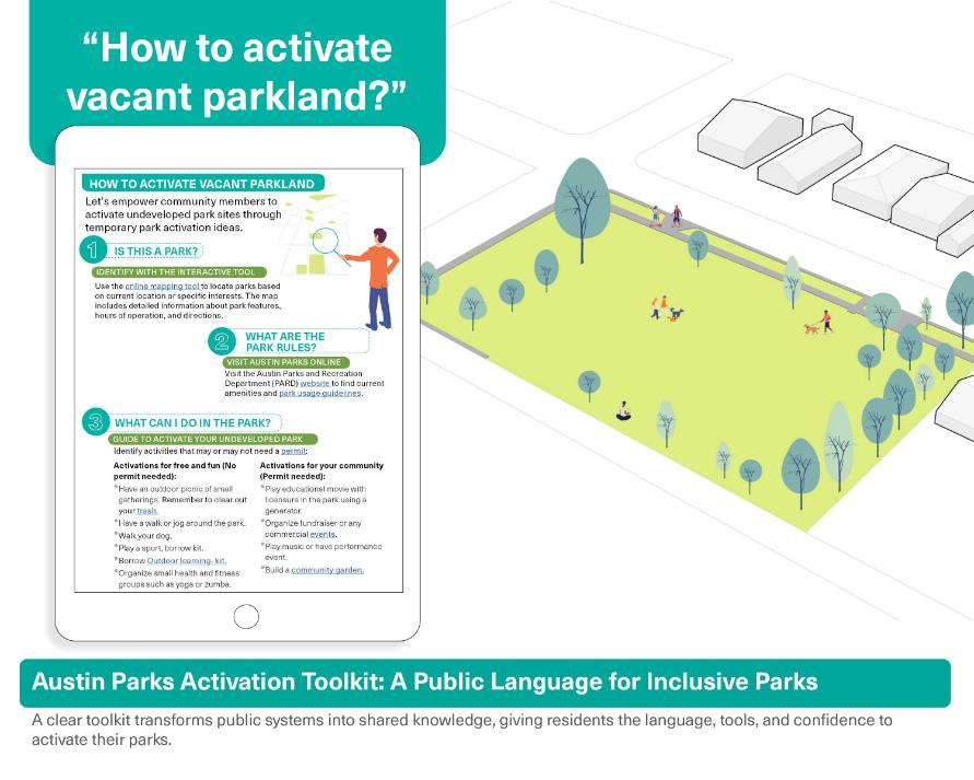 The Austin Parks Activation Toolkit is a publicly accessible digital and printable guide that simplifies Austin’s park permitting and funding systems. Created for grassroots outreach and resident training, it translates complex processes into clear, visual steps, empowering communities to plan safe, legal activations and speak the same procedural language as local government. By turning bureaucracy into actionable strategies, the toolkit fosters equity, collaboration, and place-making. This innovative, replicable model enables communities nationwide to reclaim vacant parkland and transform it into vibrant, inclusive spaces.