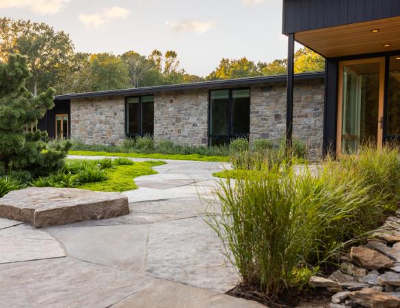 Built in 1961, this reimagined mid-century engawa style entry garden honors its modernist and Japanese-inspired roots while integrating contemporary stormwater and compositional landscape strategies. The design interprets the original work of C.C. Pinkney by restoring ceremonial arrival, layered thresholds, and circulation through a bridgecentered entry sequence. Limestone runnels and swales transform water into a visible design element, while restrained planting and authentic materials create a calm, immersive garden. The renewed landscape reconnects the home to its architectural legacy while supporting resilient, contemporary living.