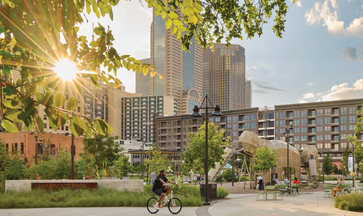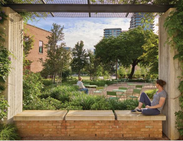 A unique addition to the Downtown Dallas park network, Harwood Park unites and transforms two city blocks into a community resource where natural systems, architectural history, and urban life converge. A variety of exterior spaces promote relaxation and recreation, while repurposed historic buildings provide the potential for activation with event, retail, and office spaces. The ecologically sensitive design integrates salvaged materials, maximizes pervious and planted areas, and showcases historic Trinity River vegetation through a central bioswale, allowing visitors to connect with history, nature, and their community all within sight of the stunning downtown skyline.