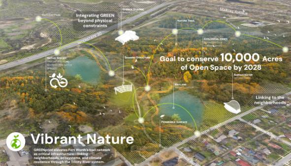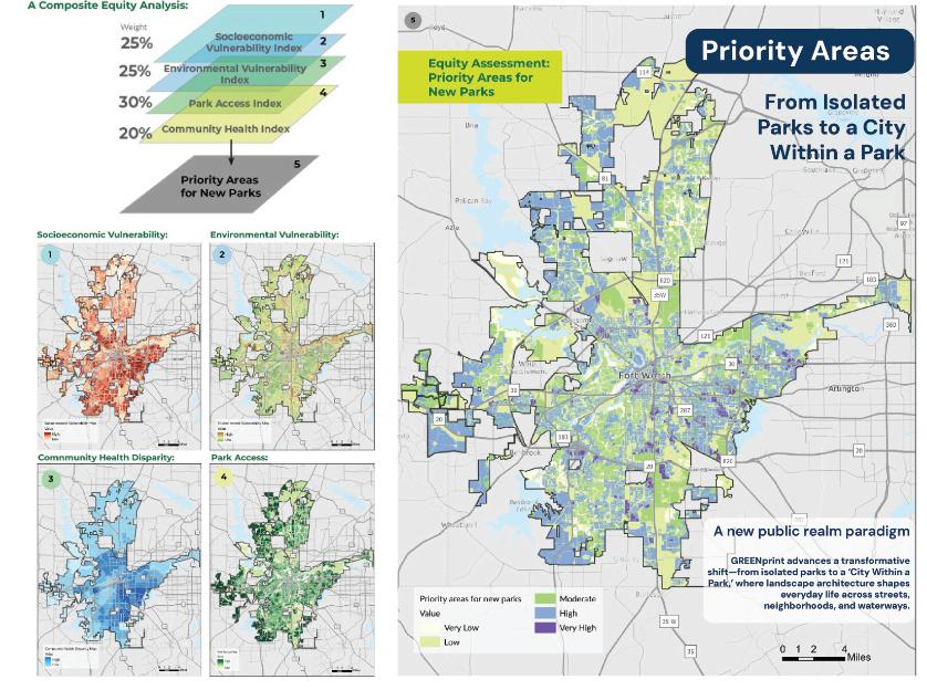 GREENprint Fort Worth charts a bold transformation of a fastgrowing city into a “City within a Park,” where daily life unfolds within a connected public landscape. Moving beyond traditional park boundaries and a traditional parks system master plan, the plan weaves nature, streets, waterways, and civic spaces into a continuous public realm that shapes how residents move, gather, and thrive. Through data-informed strategy and community co-authorship, GREENprint reimagines everyday places—neighborhood streets, corridors, and riverfronts—as shared civic assets, creating a living framework where equity, resilience, and public life are embedded into the fabric of the city.