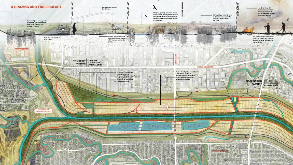 The Great Trinity Prairie is a vision for Dallas that recreates historic management regimes of the Blackland Prairie to reconnect the city to the river by leveraging its cultural identity to increase biodiversity and habitat connectivity while addressing the flood conveyance concerns. The proposal is a framework based on contemporary land management practices that simulate historic disturbance mechanisms of the Blackland Prairie to provide access to nature for historically underserved neighborhoods within Dallas and remind people that the community and culture of North Texas are integrally connected to this critically threatened ecosystem.