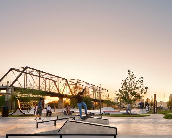 Berkley V. and Vincent M. Dawson Park transforms a community-driven vision into a cohesive, built public space that balances recreation, history, and neighborhood identity. Shaped through extensive public engagement, the park reflects local priorities while integrating diverse programs within a unified design language. Inspired by the nearby, historic Hays Street Bridge, custom materials, patterns, and detailing establish a strong sense of place. Signature features—including the skatepark, and urban garden—are seamlessly woven into an accessible landscape that supports gathering, play, and stewardship for users of all ages and abilities.