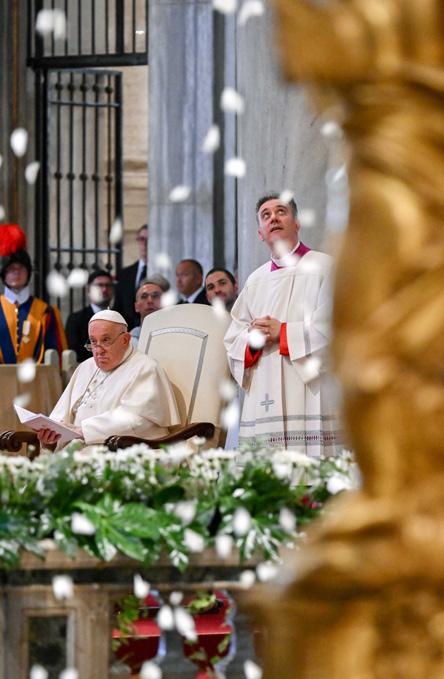 Celebrating the feast of the dedication of Rome’s Basilica of St. Mary Major and the related feast of Our Lady of the Snows Aug. 5, the pope watched white rose petals fall from the basilica’s coffered ceiling like a snowfall.