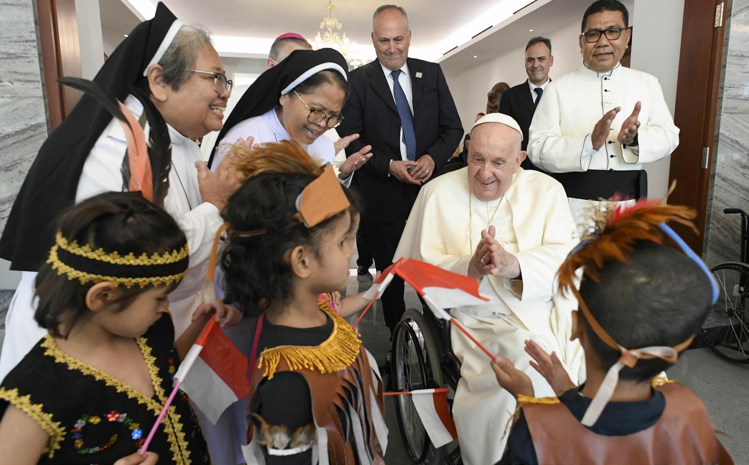 Above, Pope Francis greets a group of children who are orphaned and the Dominican sisters who care for them as they clap during a meeting at the apostolic nunciature in Jakarta, Indonesia, Sept. 3. The people the pope met are assisted by the