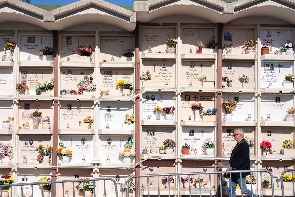 A visitor walks past a mausoleum adorned with flowers at Laurentino cemetery in Rome, where Pope Francis concelebrated Mass for the feast of All Souls, Nov. 2. He also visited a cemetery to pray at the graves of children and miscarried infants and met with a man who lost his son.