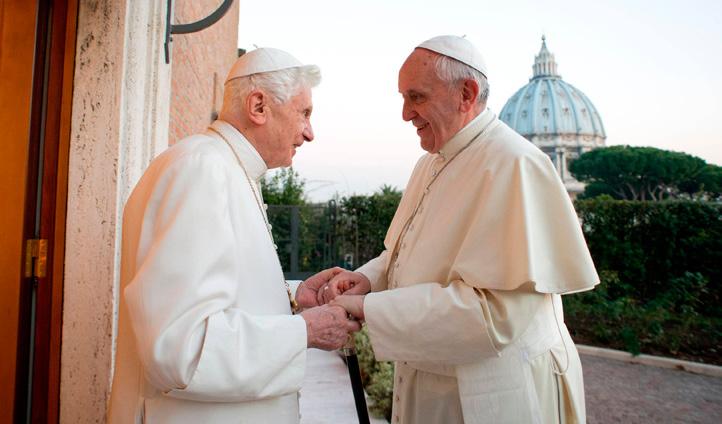Pope Francis greets retired Pope Benedict XVI at the retired pontiff’s Vatican residence Dec. 23, 2013.