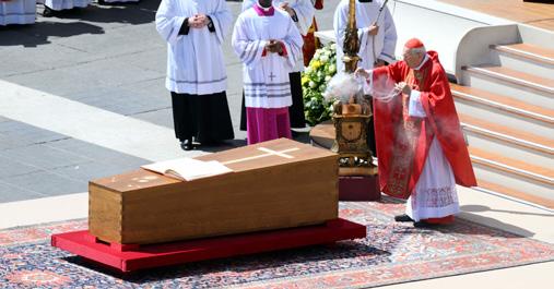 Giovanni Cardinal Battista Re, dean of the College of Cardinals, blesses the coffin as he leads the funeral Mass of Pope Francis in St. Peter’s Square at the Vatican April 26.