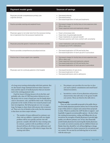 Final thoughts There are other reasonable proposals in the public discussion for family physician payment reform, but it is beyond the scope of this article to compare and contrast those proposals to mine. Whatever position the AAFP decides to support—and hopefully it supports several possible options—the fact is that the existing documentation, coding, and billing rules do not incentivize the strengths of family physicians to provide highquality cost-effective primary care. In fact, they financially punish family physicians for practicing like family physicians. As a result, our current economy and our children’s future are bleaker than they should be. Let’s all keep fighting to change the current realities for a better tomorrow for our patients and our country. We can start by not believing that we are stuck with the status quo.