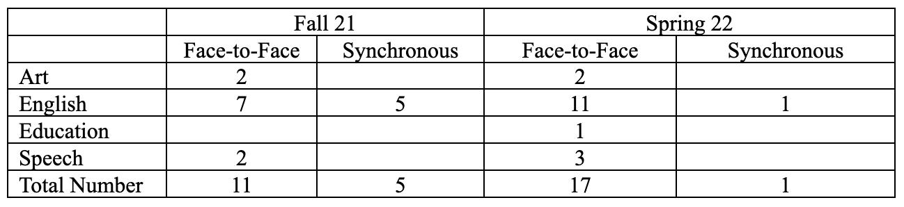 Fall 21 and Spring 22. As can be seen, most library instructions were for the English classes. Other subject courses were the Speech and Art classes.