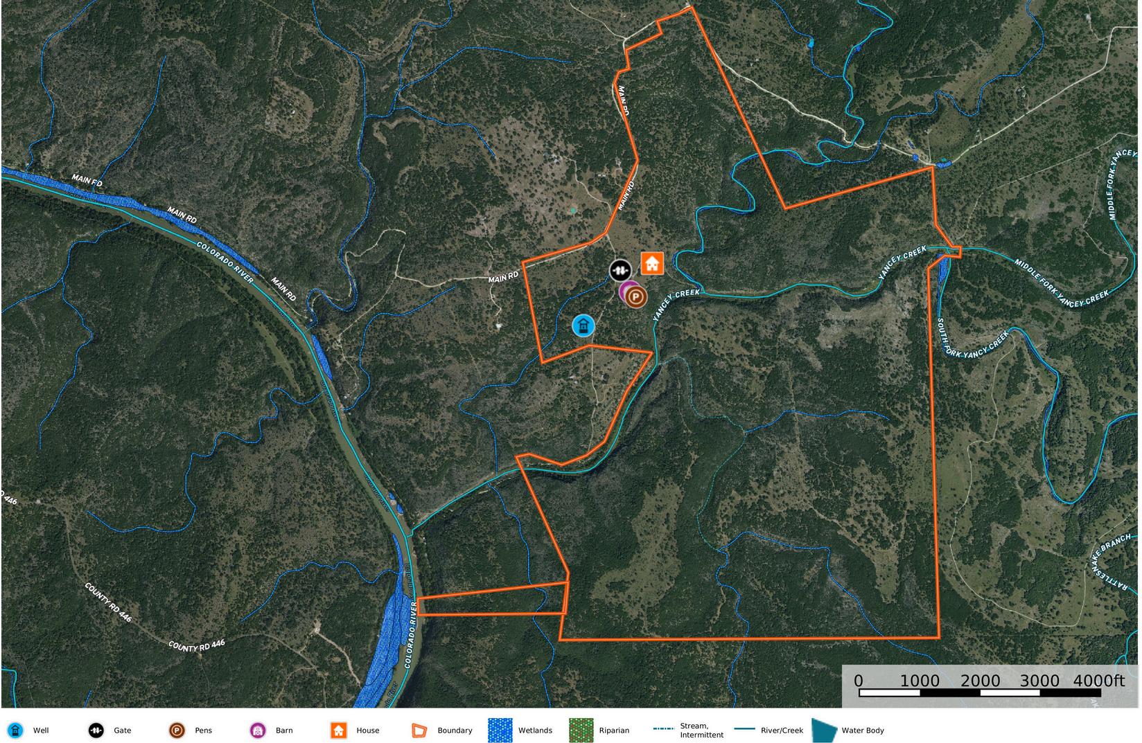 The year-round clear running Yancey Creek with its limestone bottoms and scenic bluffs, traverses through the property for about 1.5 miles and drains into the Colorado River. The ranch also offers major springs with running water, seeps, and multiple drainages. Arrowheads and interesting mineral rock deposits are commonly found throughout the property. The ranch gets an average of 28-30 or rain per year.