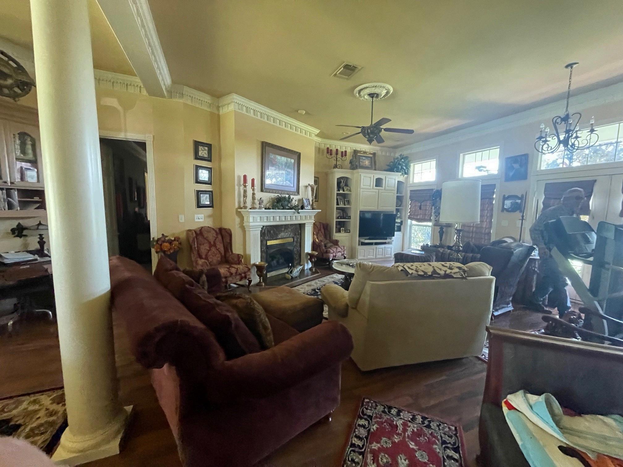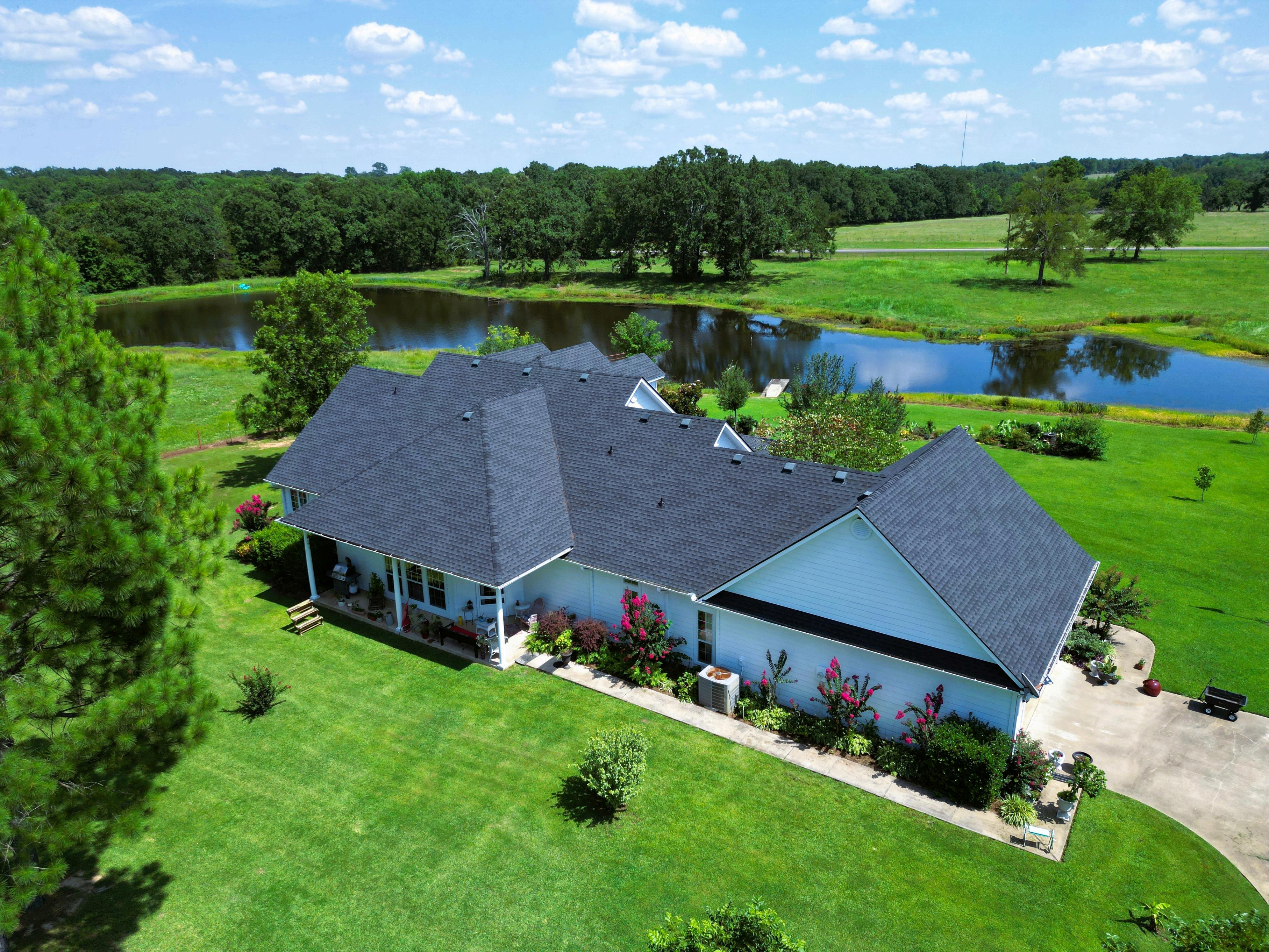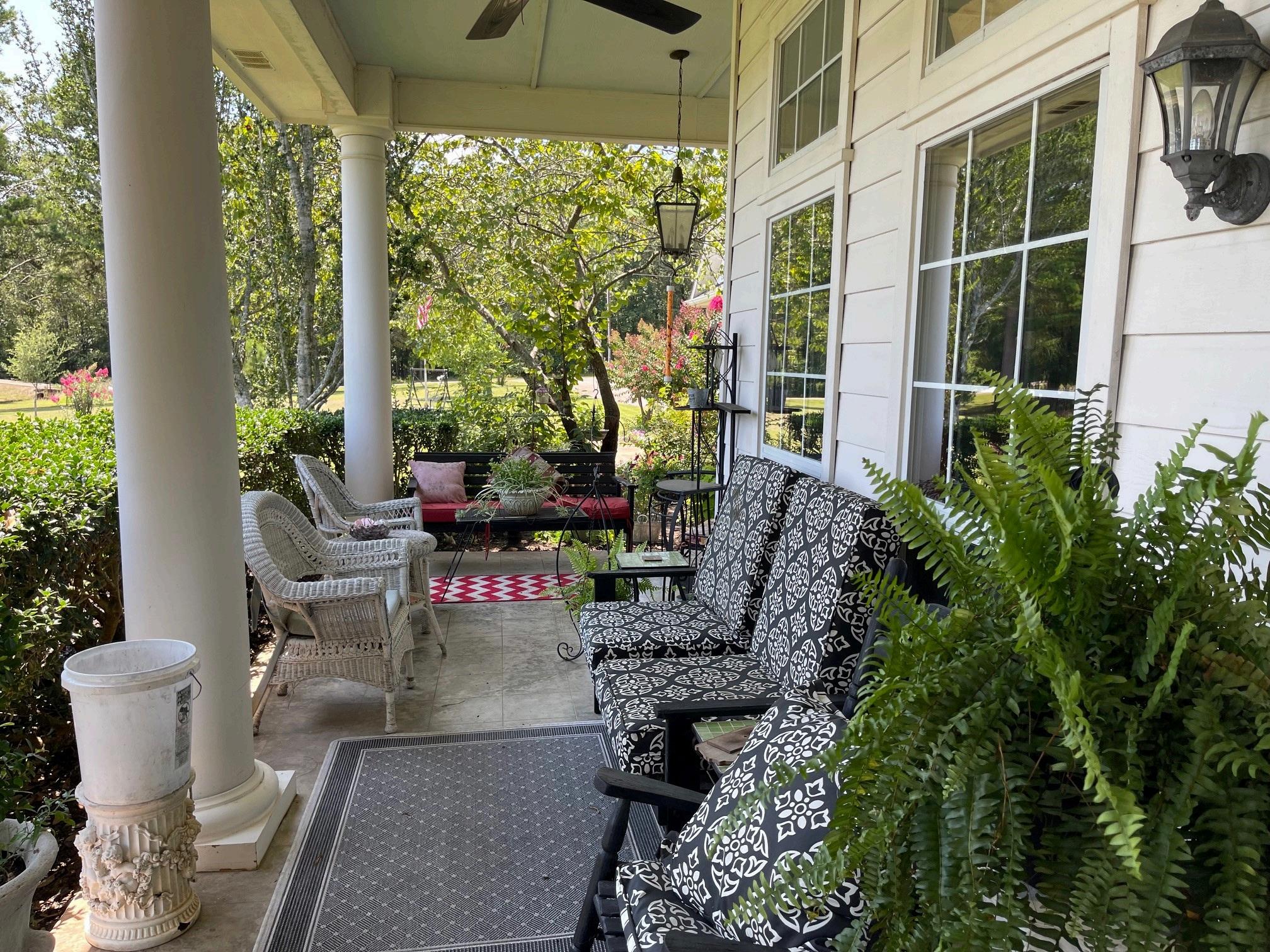 One of the best places to relax is the covered front porch with ceiling fans, colonial columns, and relaxing porch swing. Views are overlooking over a serene setting of lush landscaping with the bass lake and dock below.