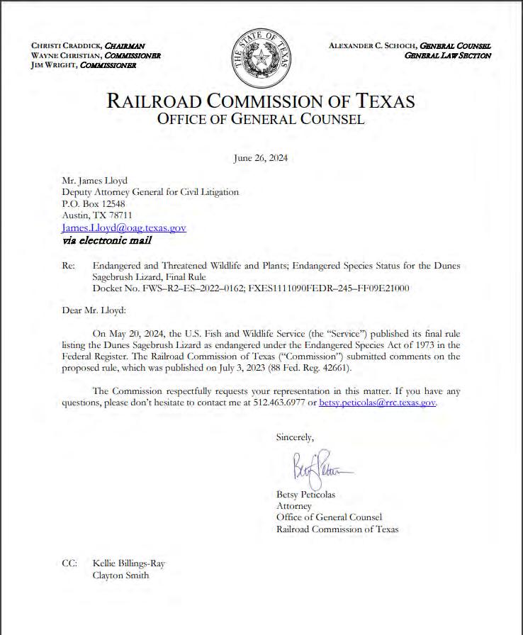 “The Biden administration doubled down on their attack of the oil and gas industry with their latest Endangered Species Act action,” said RRC Chairman Christi Craddick. “By ignoring the existing conservation plans made by state and industry leaders to protect potential Dunes Sagebrush Lizard habitat, the administration makes it clear that this is nothing more than a political game. I am proud to push back against these unscientific and irresponsible regulations and appreciate the Office of Attorney General for supporting our efforts.”