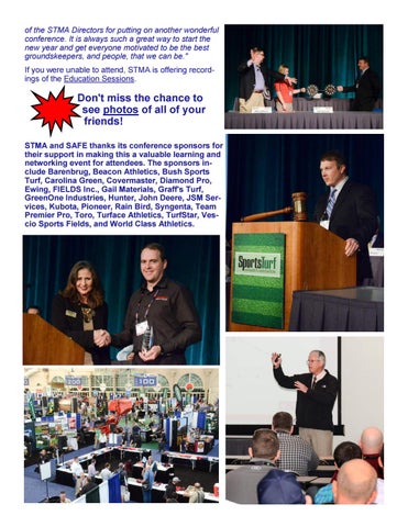 Don't miss the chance to see photos of all of your friends! STMA and SAFE thanks its conference sponsors for their support in making this a valuable learning and networking event for attendees. The sponsors include Barenbrug, Beacon Athletics, Bush Sports Turf, Carolina Green, Covermaster, Diamond Pro, Ewing, FIELDS Inc., Gail Materials, Graff's Turf, GreenOne Industries, Hunter, John Deere, JSM Services, Kubota, Pioneer, Rain Bird, Syngenta, Team Premier Pro, Toro, Turface Athletics, TurfStar, Vescio Sports Fields, and World Class Athletics.