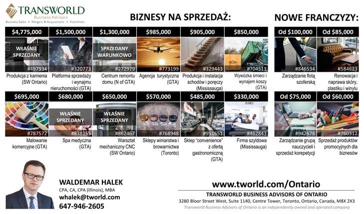 (W.H.)Waldemar Halek jest biegłym księgowym w Kanadzie i Stanach Zjednoczonych. Posiada tytuł magistra administracji biznesowej. Jest on również Prezesem Transworld Business Advisors of Ontario - firmy brokersko-doradczej dla małych i średnich biznesów oraz Prezesem Canada-Poland Chamber of Commerce. Z Waldemarem można się skontaktować poprzez e-mail: whalek@tworld.com.