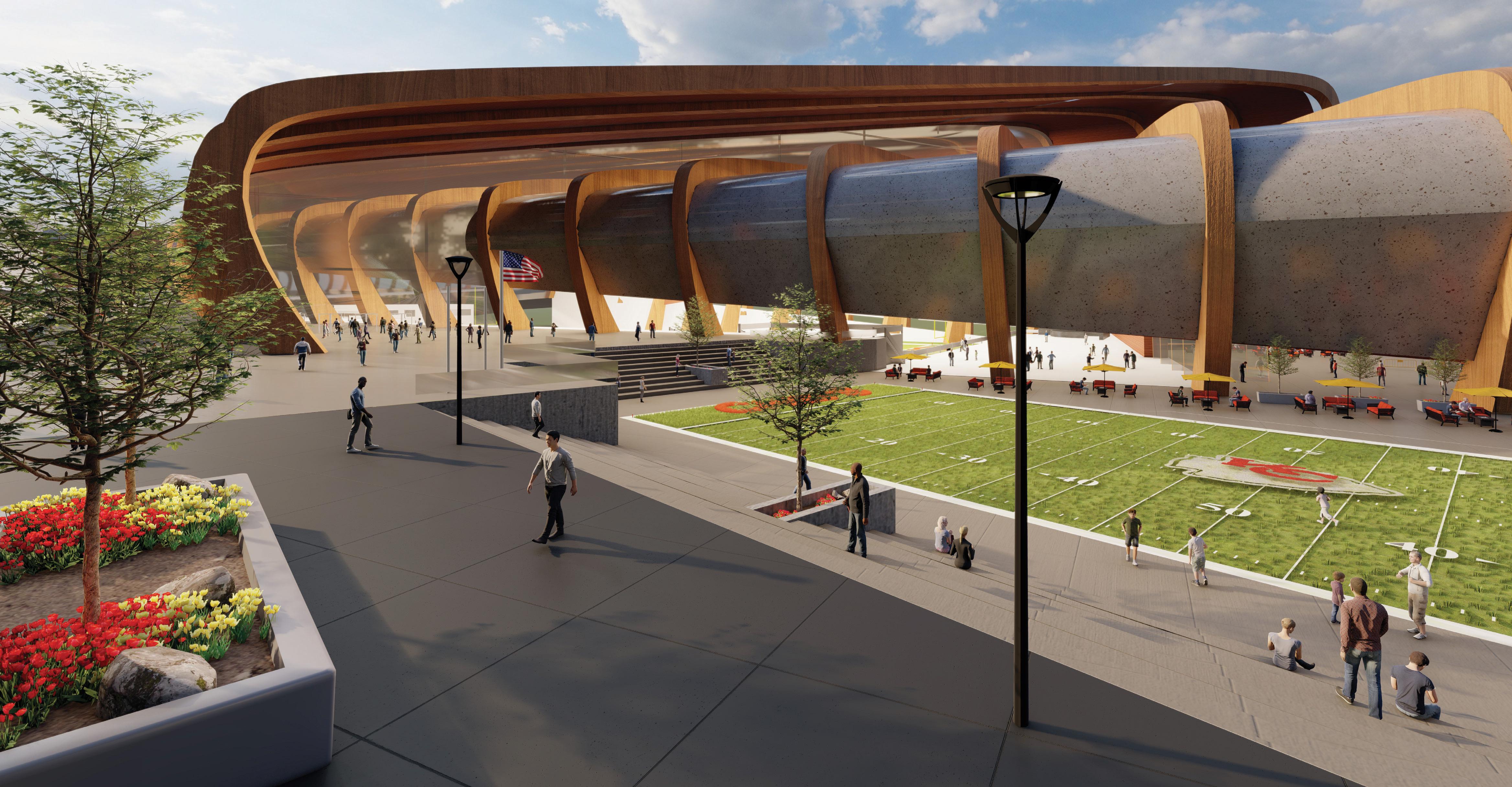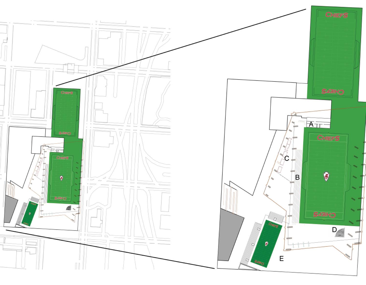 The concept behind this project was to allow the NFL Kansas City Chiefs to have an updated practice facility closer to its current stadium. With the location of the current facility an hour away, having a closer and more updated facility in downtown Kansas City was a major factor in deciding the location of this project. Since this is a financial district, a mostly nineto-five type of area with little casual foot traffic, we wanted to design a space that would allow the area to be more populated with more overall foot traffic and also create a central location for other activities to use this space. This development would also allow the team, the community and the city to have stronger relationships.
