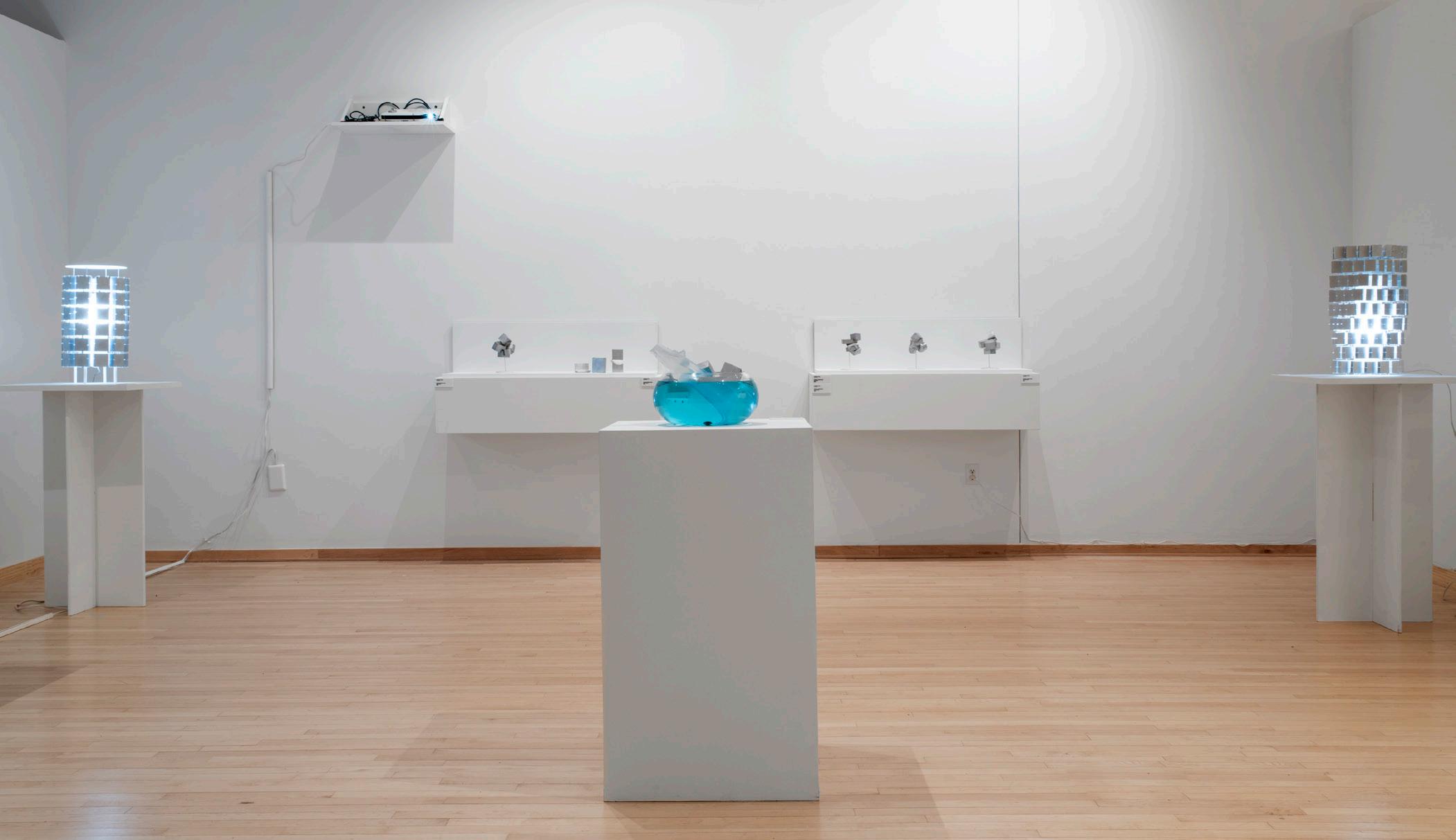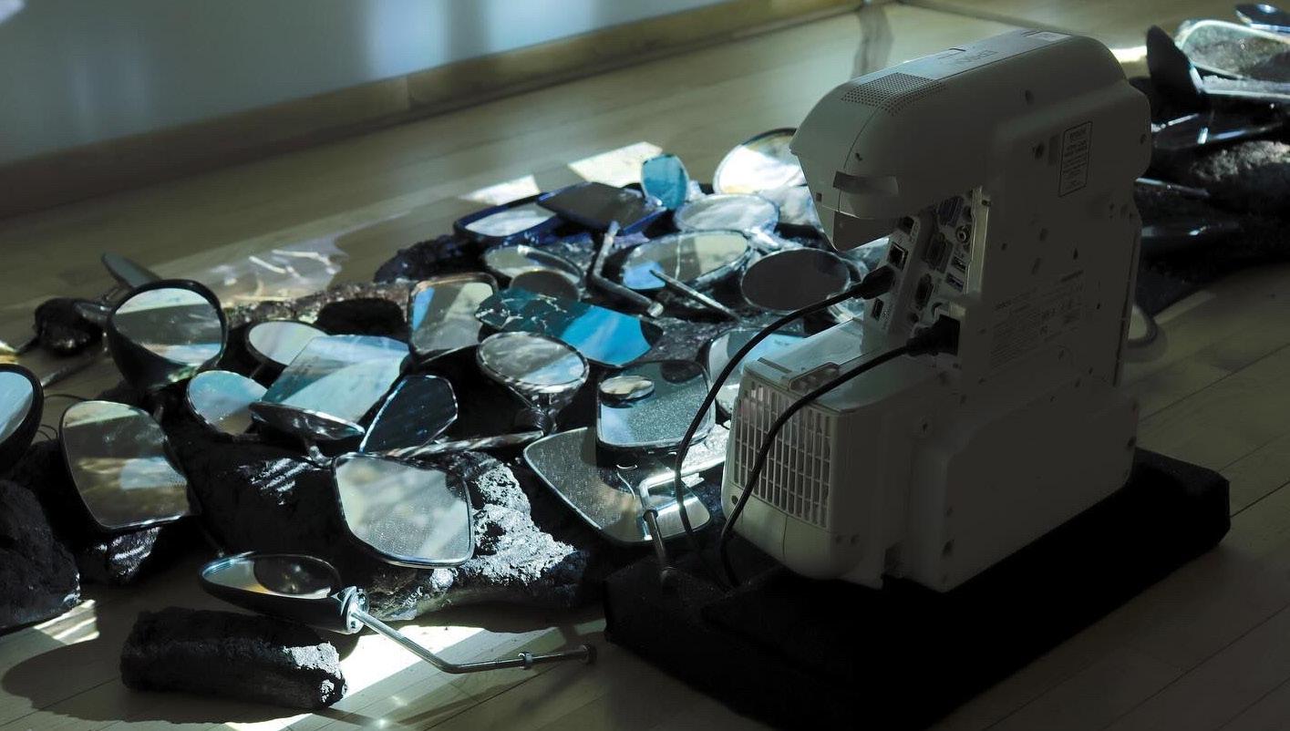 Emanating from a crucible of salvaged automotive mirrors nestled on an uneven platform made of lustrous asphalt, pools of silvery light glint and flicker across the gallery’s walls. Molly Burt-Westvig’s monumental video sculpture To Trace a Sunbeam is activated by a pair of short-throw projectors that are positioned just above the amalgamation of mirrored glass and solidified oil. These projectors emit a video of water bubbling on the surface of a highway. The combination of projections thus transforms the gallery into an aquatic environment.