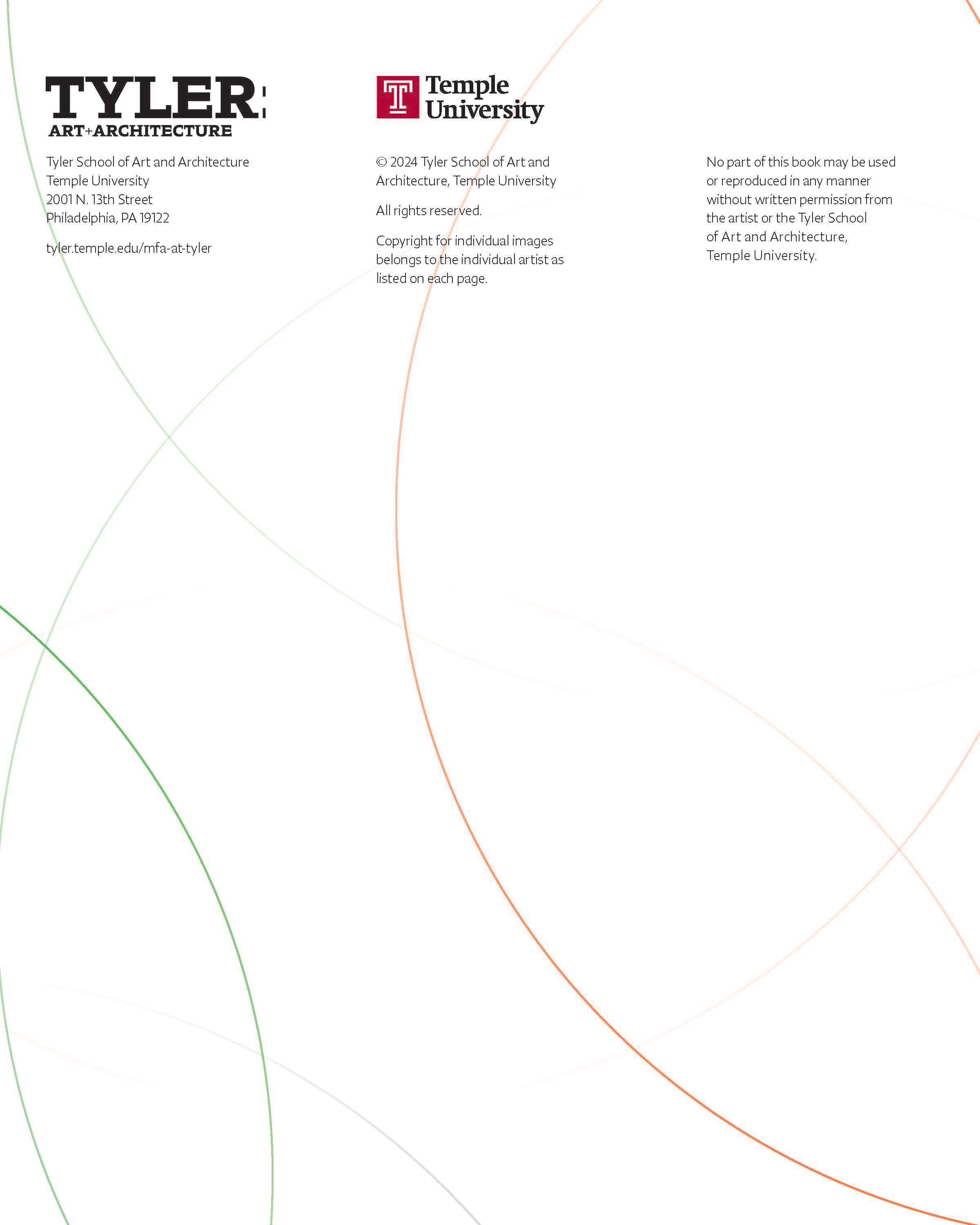 It is a privilege to present the 12th annual edition of the Tyler School of Art and Architecture’s graduate catalog, featuring the work of our 2024 MFA graduates as illuminated by essays by our art history master’s and doctoral students. This longstanding collaboration across Tyler’s disciplines highlights the connections among our community.