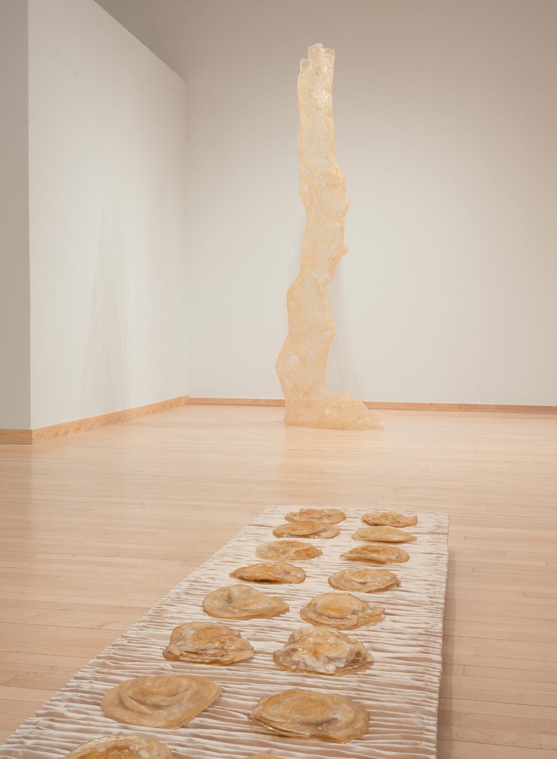 Representing a tapestry greater than any individual identity, Hagiladi’s most significant piece is a monochromatic glass sculpture that spans a wall that creates a composite landscape modeled from a photograph she took two years ago. The image represents a graveyard of fallen trees that lie uprooted and immovable. The transparent glass landscape of fallen trees requires the viewer to look beyond the image to the centuries past. Hagiladi’s glass panels hold the personal fractures she attempts to heal through making this work.