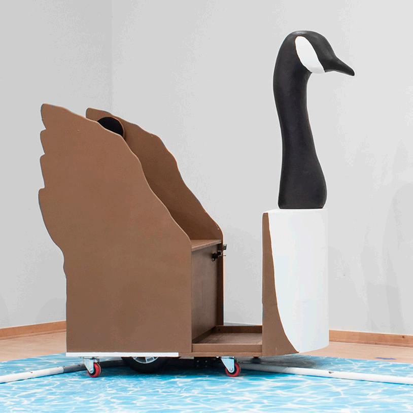Once aboard the single-rider goose-shaped vehicle, participants embark on a fleeting, yet exhilarating 15-second journey around the curving track. As they manipulate an acceleration lever, the goose tram swiftly maneuvers through simulated waters, mimicking the unpredictable trajectories of the avian protagonist depicted in the video. The rider is faced with the conundrum of the goose and questions of their own adherence to the rules of the installation. Goss ingeniously coerces viewers into an act of conformity with which they must now come to terms. After riding within the form of the goose, viewers must confront their own role within the law and ultimately ask themselves, “how can I be more like the goose?”