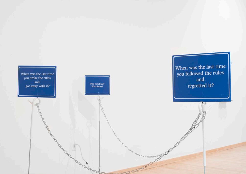 Upon completion of the video experience, viewers are directed to join a queue that leads to the entrance of a makeshift tram ride shaped like a goose. Waiting in line beside stanchions, viewers are urged to engage in dialogue with fellow attendees. Thought-provoking questions adorn the stanchions, fostering discussions on rule-breaking, regret, and the societal implications of adherence to or defiance of rules.
